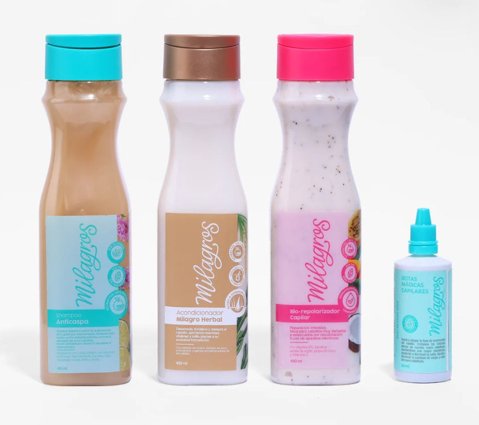 Incluye: Shampoo Anticaspa que purifica y refresca, Acondicionador Herbal que hidrata y suaviza, Bio Repolarizador que repara y fortalece, y Gotas Mágicas que activan el crecimiento y mejoran la salud del cuero cabelludo.