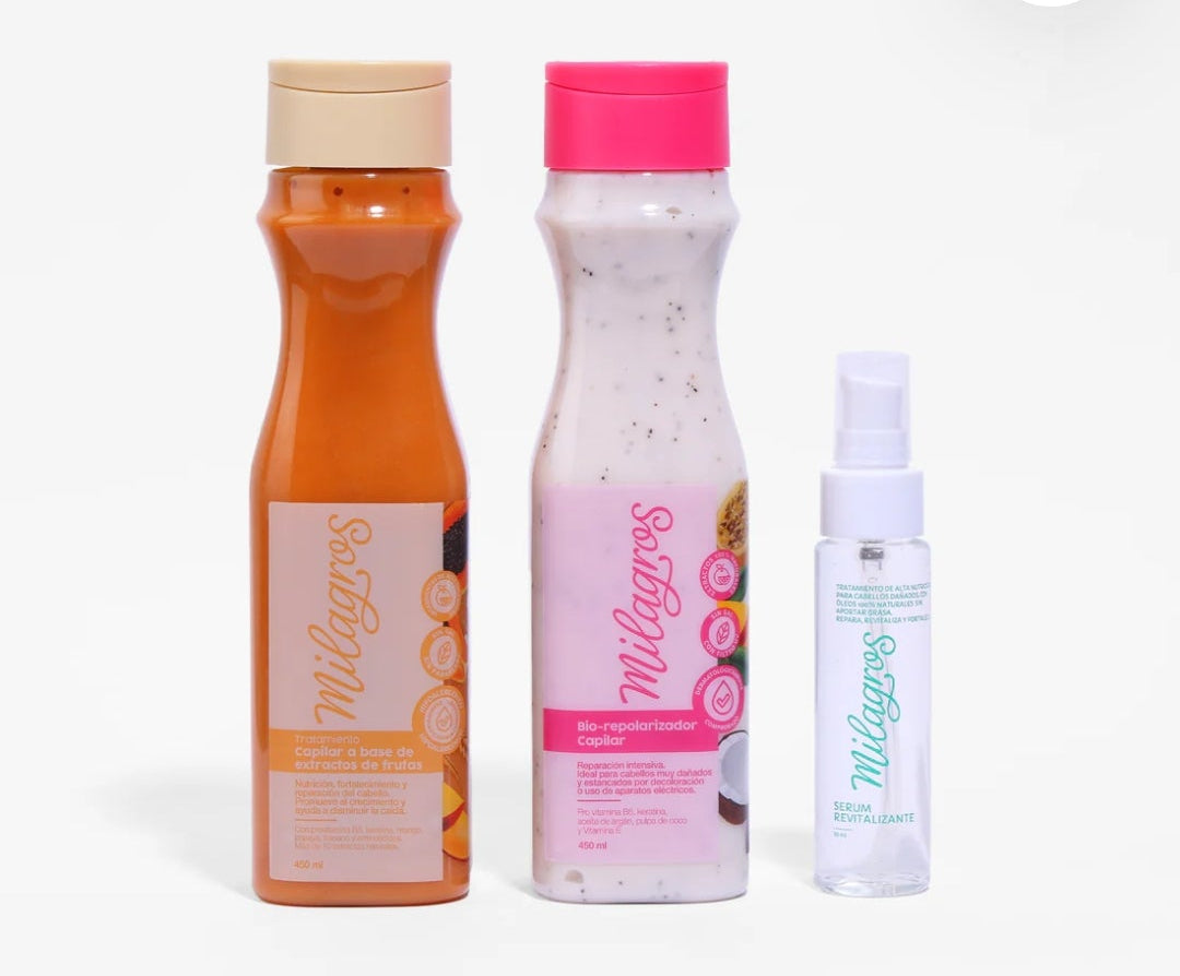 El kit incluye Bio Repolarizador, Tratamiento Frutas y Serum Revitalizante de Frutas, tres productos que trabajan juntos para hidratar profundamente, fortalecer la fibra capilar y recuperar el cabello maltratado.