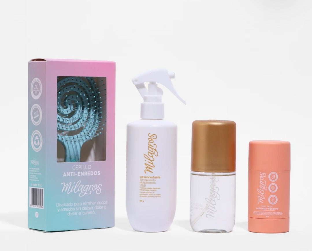 Este kit reúne tres esenciales de alto desempeño: Cepillo Capilar Termoprotector, Perfume Capilar Gold y Hair Wax, creados para cuidar, proteger y estilizar tu cabello con un toque de lujo.