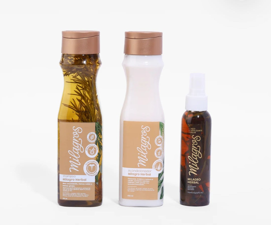 Incluye tres productos estrella: el Tónico Milagro Herbal, con romero, canela, eucalipto y anís 100% naturales, clínicamente comprobado para reducir la caída; el Shampoo Milagro Herbal, enriquecido con romero y jengibre 100% natural, con eficacia seborreguladora comprobada; y el Acondicionador Milagro Herbal, dermatológicamente probado, con extracto de arroz, romero y aminoácidos que fortalecen la fibra capilar, previenen la caída por quiebre y dejan el cabello suave, sedoso y revitalizado.