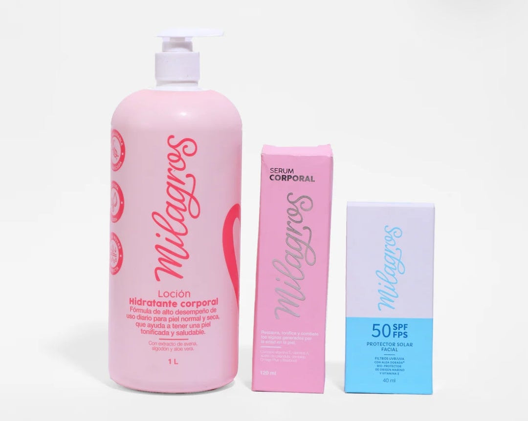 Incluye Crema Corporal, Sérum Corporal y Protector Solar sin color, tres aliados esenciales que hidratan, nutren y resguardan la piel frente a los factores externos.