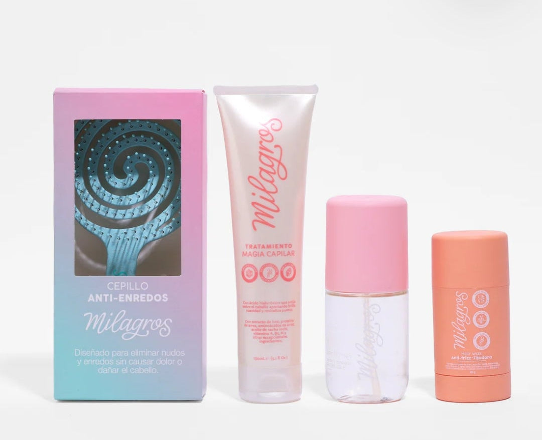 Este kit incluye Hair Wax, Tratamiento Magia, Cepillo Capilar y Perfume Capilar, una combinación perfecta para cuidar, proteger y mantener tu cabello siempre impecable.