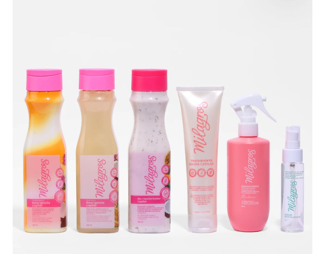 Incluye: Shampoo y Tratamiento Emergencia que reparan y fortalecen, Bio Repolarizador que reestructura y aporta suavidad, Tratamiento Magia que nutre y controla el frizz, Desenredante Martina para suavizar y facilitar el peinado, Termoprotector que protege del calor, y Sérum Revitalizante que sella puntas y potencia el brillo.